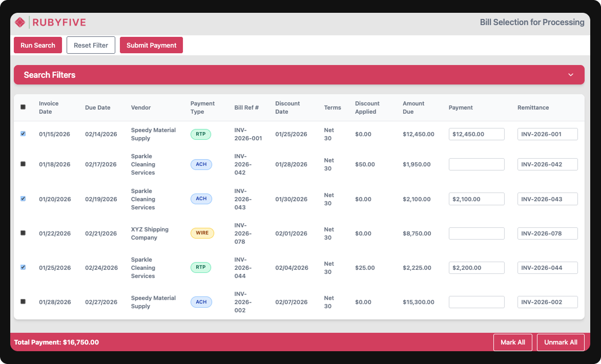 RUBYFIVE connects your ERP to your bank through secure APIs — allowing finance teams to initiate, route, and settle payments without files, portals, or manual reconciliation.